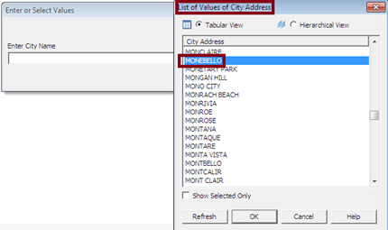 Note: In the Hierarchical View, only City prompt will be asked user to select the values and all other information (like Country & State) can be select internal in the List values.