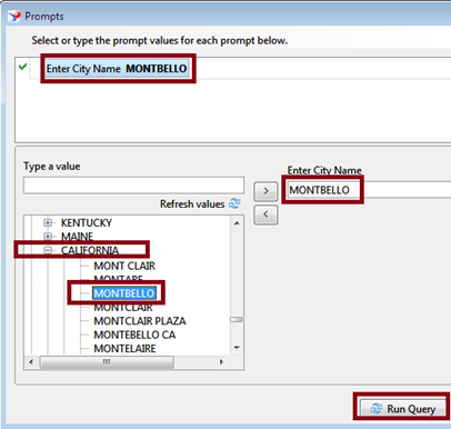 3. Run the report. Then the report will ask user to enter / sect the values in the order of City – State – Country.