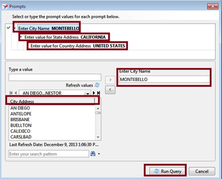 2. Run the report. Then the report will ask user to enter / sect the values in the order of City – State – Country.