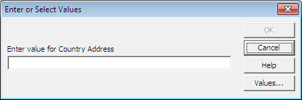 6. Click Values. It will ask user “Enter Value for Country Address”.