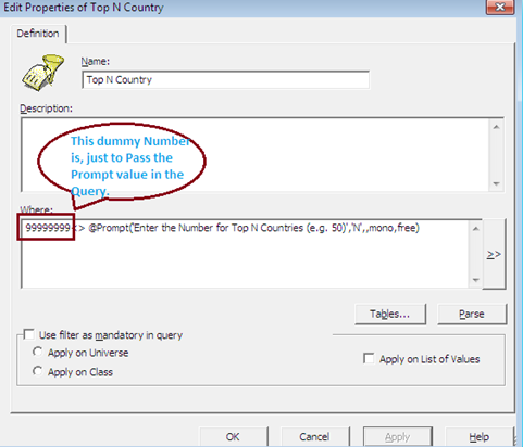 1. Create a dummy Conditional Prompt object in universe designer to enter the Top N Numbers (This object is used to get the user input at the Query level there won’t be any calculation in the Query).