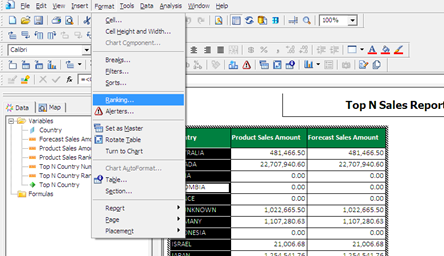 6. Now apply the Ranking on top of Country object in the report. Select the Country cell in the report and apply Ranking.