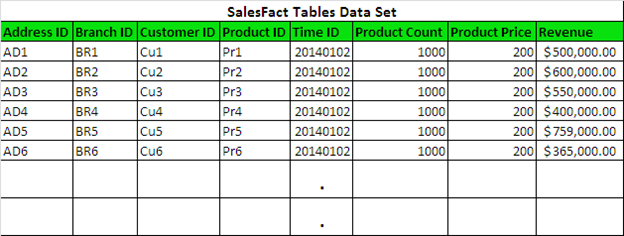 Example, we have 5 Dimension tables and one fact table which holds complete data transactional data in data warehouse. Based on the dimension in your report to get the data is really huge load to that fact table and the report won’t finish as you expected. Fact table hold the data for Daily transaction for each, customer, Product and branch and this can be expressed as follows.