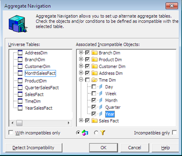 Compatible / Incompatible definition can be done in Universe Designer, Tools – Aggregate Navigation option.