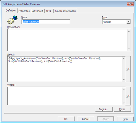 Select : @Aggregate_Aware(sum(YearSalesFact.Revenue), sum(QuarterSalesFact.Revenue),
