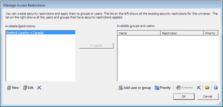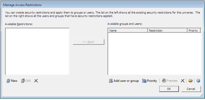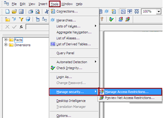 1. Universe Designer – Tools – Manage Security –Manage Access Restrictions.