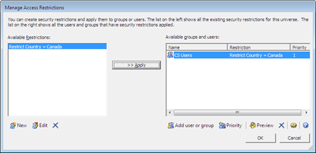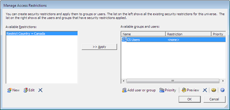 6. Select available restrictions and available users and groups and Apply.