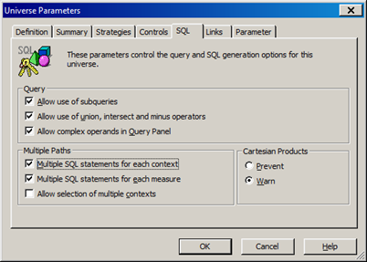 4. Once you created the context for each fact tables along with alias table as mentioned above and enable the “Multiple SQL Statements for each Context” in universe designer parameter, SQL tab. This is common solution for Chasm Trap.