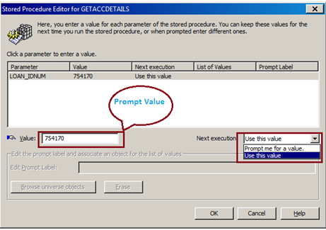 5. Once you click insert the Stored procedures, If stored procedure has parameters, it will now ask you to enter information for the Parameter, Prompt Label and what it should do on ‘Next execution’.