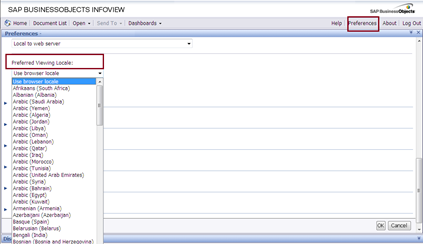 Preferred viewing locale (PVL) – This is your preferred viewing language settings. This defines the language in which strings, text and format – the parts of the resource (document or universe) content or attribute list – appear in the application on InfoView or Web Intelligence Rich Client.