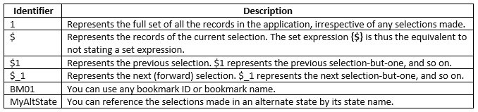 Identifiers. One or more identifiers define the relationship between the set expression and what is being evaluated in the rest of the expression. A simple set expression consists of a single identifier, such as the dollar sign, {$}, which means all records in the current selection.