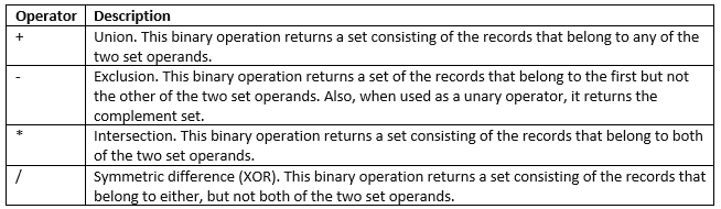 Operators are used to include, exclude, or intersect parts of or whole data sets. All operators use sets as operands and return a set as result.