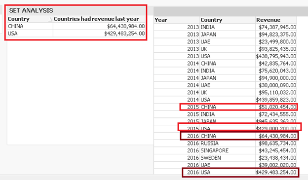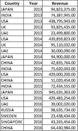 To find out which are all the countries had revues on last year (as per our data set last year is 2016 and previous year is 2015), Function P used to find out the countries and only CHINA & USA had revues in 2015.
