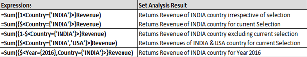 Example for set Analysis: sum( {$<Year={2014}>} Revenue ), in which {$<Year={2014}>} is a set expression.