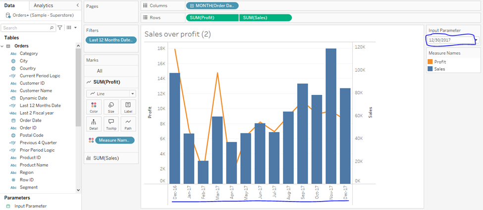 and date(datetrunc(‘month’,[Order Date]))<=date(datetrunc(‘month’,dateadd(‘month’,-12,[Input Parameter])))